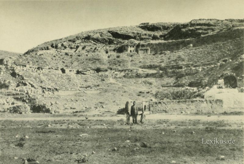 Blick von Norden auf das große Theater, welches für mehr als 4000 Menschen Platz hatte. Die Bühne ist nicht erhalten, der unterste Teil des halbkreisförmigen Zuschauerraums steckt im Boden und nur 5 Stufen des untersten Ranges ragen hervor; der mittlere Rang hat 14, der obere 16 Sitzreihen. Den obersten Teil bildete eine Säulenhalle, hinter deren Umgang einige Felsgemächer liegen. Das Theater war aus festem, graugelbem Kalkstein erbaut. Vor ihm dehnte sich ein rechteckiger freier Platz mit Säulenhallen aus, von denen noch einige erhalten sind. Neuerdings ist das Theater leider durch Einbau moderner Wohngebäude stark entstellt worden. Auch wurden die Sitzreihen in der Mitte des Theaters im April 1918 durch einen englischen Granatenvolltreffer stark beschädigt.