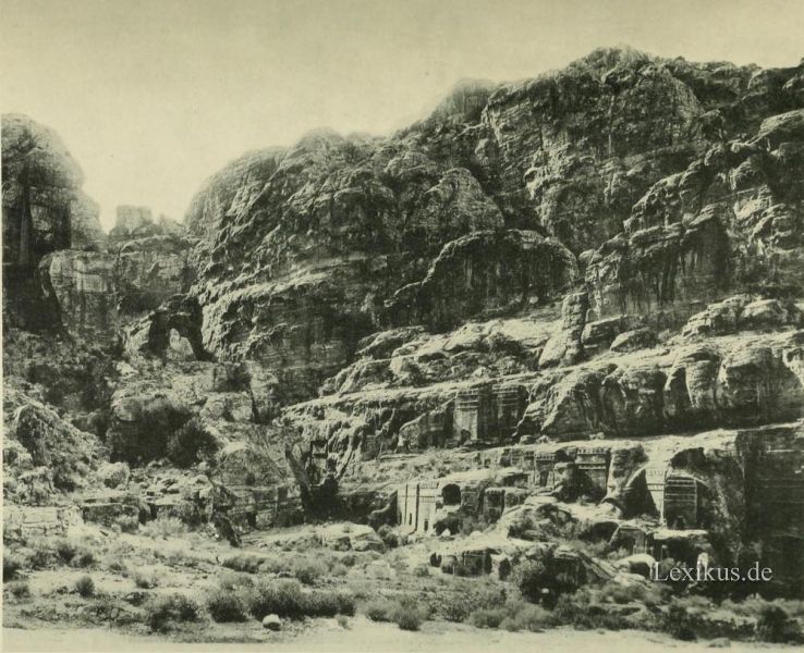 Die ältere Art, Felsfassaden zu dekorieren, war äußerst einfach und lehnte sich an die Pylonenform ägyptischer Gräber an. Einige Streifen mit Dreieckmustern bildeten das Ornament und stets führte nur eine Tür in das Innere. Diese Dekorationsart war bis tief nach Arabien hinein verbreitet. Beispiele davon zeigt Taf. 11 (oben) aus Madâin Sâleh nach einer Aufnahme des K. osm. Fliegerleutnants Herrn Dittmar.