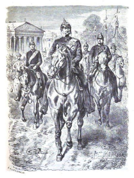 Der Vorgang war gewiss historisch würdig, und ich wandte ihm meine gespannteste Aufmerksamkeit zu, zunächst natürlich seiner äußeren malerischen Erscheinung, notierte in aller Eile das Nötigste, sah, dass König Wilhelm etwas sprach und dass Graf Bismarck mit hölzerner Stimme etwas Längeres vorlas, hörte aber nicht, was es bedeutete, und erwachte aus meiner Vertiefung erst, als der Großherzog von Baden neben König Wilhelm trat und mit lauter Stimme in den Saal hineinrief: „Seine Majestät, Kaiser Wilhelm der Siegreiche, Er lebe hoch!" Ein dreimaliges Donnergetöse unter dem Geklirr der Waffen antwortete darauf, ich schrie mit und konnte natürlich dabei nicht zeichnen; von unten her antwortete wie ein Echo sich fortpflanzend das Hurra der dort aufgestellten Truppen. Der historische Akt war vorbei: es gab wieder ein Deutsches Reich und einen Deutschen Kaiser! Ich sah noch, wie der Kaiser den Kronprinzen umarmte und von den ihn umgebenden deutschen Fürsten beglückwünscht wurde. Eine beabsichtigte Defiliercour der anwesenden Offiziere missglückte, wie mir däuchte, und ich sah dann den Kaiser die Stufen der Estrade hinabschreiten, an Bismarck vorbei, den er nicht zu bemerken schien. Neun Jahre später, bei meinem Aufenthalte 1880 in Friedrichsruhe, gab mir Fürst Bismarck die Erläuterung zu dieser kleinen Episode, die ich damals dem nach Schluss des Staatsaktes entstandenen Durcheinander der sich auflösenden Versammlung zuschrieb.