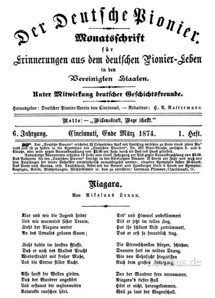 Monatsschrift für Erinnerungen aus dem deutschen Ponier-Leben in den Vereinigten Staaten. Unter Mitwirkung deutscher Geschichtsfreunde. Herausgeber: Deutscher Pionier-Verein von Cincinnati. — Redakteur: H. A. Rattermann. Motto: —„Wissenskraft, Wege schafft." 6. Jahrgang. Cincinnati, Ende März 1874. 1. Heft.
