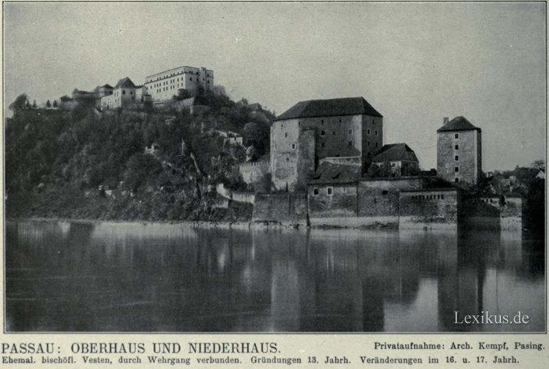 027 Passau, Oberhaus und Niederhaus. Ehemal. bischöfl. Vesten, durch Wehrgang verbunden. Gründungen 13. Jahrh. Veränderungen im 16. u. 17. Jahrh.