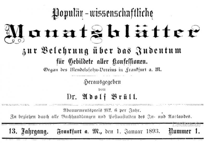 Aus: Populär-wissenschaftliche Monatsblätter zur Belehrung über das Judentum für Gebildete aller Konfessionen. Organ des Mendelssohn-Vereins in Frankfurt a. M. Herausgegeben von Brüll, Adolf (1846-1908) Dr. Rabbiner, Religionspädagoge, Religionswissenschaftler, Redakteur, Freimaurer