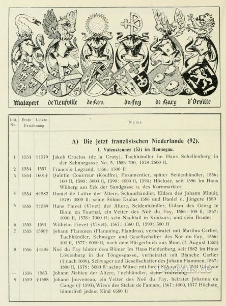 Hätte ich wirklich bei jedem einzelnen der 1046 Kaufleute und Krämer, welche ich im ersten Band für die Zeit von 1210 bis 1554 nachgewiesen habe, immer wieder die gleichen Quellen (Steuerbücher, Schöffengerichtsprotokolle, die gedruckten Inventare) angeben sollen, und hätte ich dies auch bei den vielen hundert eingewanderten Belgiern und Franzosen, welche ich in diesem zweiten Bande aufzähle, tun sollen. Ich denke, der einmalige genaue Hinweis in der Vorrede dürfte genügen! Und die Literaturzusammenstellungen der neueren Frankfurter Geschichtswerke bringen immer wieder dieselben bekannten Verfassernamen und Titel, wie sie auch in jedem besseren Frankfurtensienkatalog hiesiger Antiquariatsbuchhandlungen zu lesen sind.