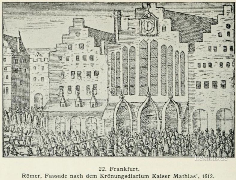 22. Frankfurt. Römer, Fassade nach dem Krönungsdiarium Kaiser Mathias, 1612.