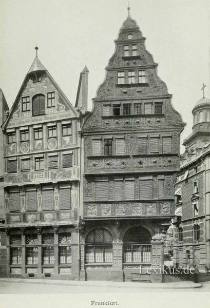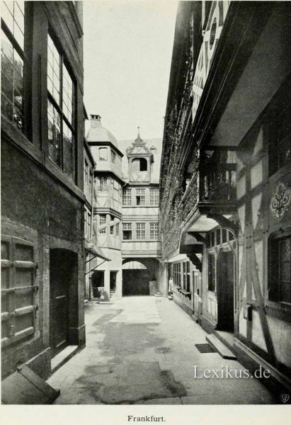 So ging 1510 die Viole, 1542 Schwarzenfels und 1596 Löwenstein mit Wanebach in den Besitz des Rates über. Nach längerer Pause musste man sich zu neuen Ankäufen entschließen. 1843 erwarb die Stadt das schöne Salzhaus (Taf. 8 u. 9) und den Frauenstein und 1878 den Rest des Baublocks, das Eckhaus Laderam-Altlimpurg mit dem Silberberg, so dass schließlich der ganze Häuserkomplex zwischen Römerberg, Wedelgasse, Römergasse, Kerben- und Limpurggasse für die Zwecke der städtischen Verwaltung in Anspruch genommen war. Wenn nun auch nicht geleugnet werden soll, dass durch den Zukauf so vieler Geschlechterhäuser der Römer sich nicht zu einem einheitlichen Rathausbau auswuchs, so ist doch der ungeheure ästhetische und kulturgeschichtliche Gewinn einer solchen Erweiterung nicht zu verkennen. Dadurch, dass man nicht die Nebenhäuser abbrach, um sie unter Begradigung der Fronten, Verbreiterung der Straßen, Ausgleich der Geschossunterschiede durch einen für zeitgemäß erachteten Neubau zu ersetzen, vielmehr die Innenräume für Amtszwecke neu einrichtete, die Fassaden aber unverändert Hess, ist uns und der Nachwelt eines der interessantesten Stücke von Alt-Frankfurt erhalten geblieben (Taf. 4). Niemand nimmt heute Anstoß daran, dass kein Giebel dem andern gleicht weder in der Höhe noch in der Breite, weder in der Architektur noch im Material. Der ganze Zauber entschwundener Kulturen empfängt uns, betreten wir die Höfe mit ihren Erkern, Galerien, Treppentürmchen und Brunnen (Taf. 5—7).