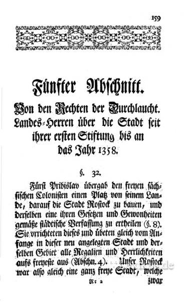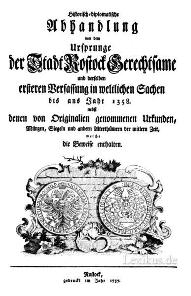 Historisch-diplomatische Abhandlung von dem Ursprung der Stadt Rostock Gerechtsame und derselben ersteren Verfassung in weltlichen Sachen bis ans Jahr 1358.