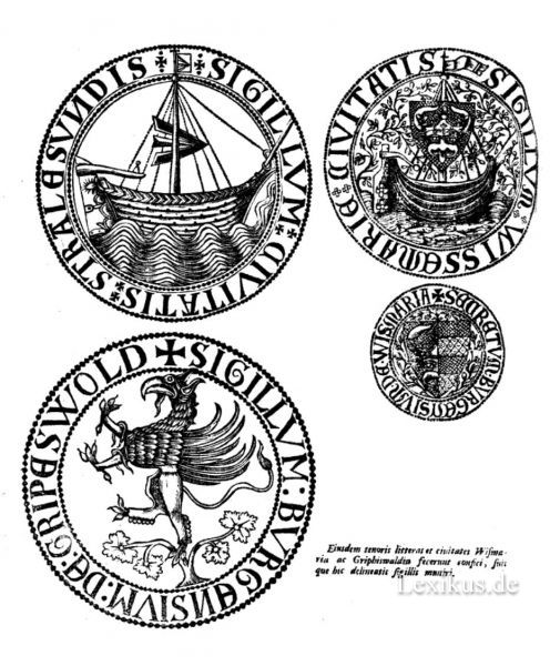 Von denen bei den abgedruckten Urkunden vorgekommenen Siegeln, hat man zugleich einen Abriss mitteilen wollen; und also verschiedene Siegel der Dänischen Könige, Mecklenburgischen Regenten und wendischen Städte welche zum Teil bisher noch nirgends zum Teil aber sehr fehlerhaft abgezeichnet worden, zum Vorschein gebracht. So hat man auch die Rostockischen Münzen Mittlerer Zeiten, so viel davon in des Verfassers Münz-Kabinett vorhanden sind, auf der 21. Beilage abgebildet. Die daselbst den ersten Platz einehmende Münze ist ein silberner mit dem Buchstaben r bezeichneter rostockischer Bracteat und gewiss, da man wenige dergleichen alte städtische Münzen hat sehr rar. Von der anderen in der Ordnung, welche kein Hohlmünze sondern ein Solidus, ist die nur auf einer Seite befindliche Umschrift ausgegangen und mit aller angewandten Bemühung nicht heraus zu bringen gewesen; man hält aber solche für eine rostockische Münze. Dahingegen ist man von denen dreien folgenden Bracteaten zweifelhaft, ob solche zu den rostockischen zu zählen sind, weilen das darauf befindliche Tier, nicht den rostockischen Greif, sondern einen Löwen vorzustellen scheint.