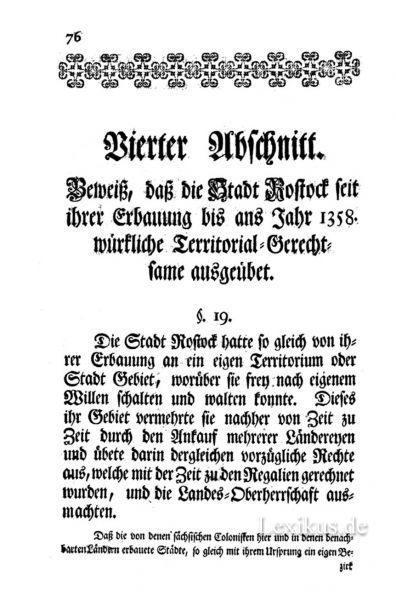 Gegenwärtige Abhandlung ist sowohl in Betracht ihres Ursprungs, als der Vollendung unter die zufälligen Dinge zu rechnen. E. E. Rat dieser Stadt hatte dem Verfasser derselben die Wiederlegung einer Schrift worin einige der Stadt Gerechtsame angefochten waren, aufgetragen. Dieses Geschäft erforderte eine Untersuchung des Zustandes der rostockischen geistlichen und weltlichen Gerichtsbarkeit in denen ältesten Zeiten und solcher ließ sich ohne zuverlässige Bestimmung des ersten Ursprunges der Gerechtsame dieser Stadt nicht herausbringen. Hier merkte der Verfasser bei den Geschichten der mittleren Zeiten eine behindernde Dunkelheit, die damalige politische Verfassung genugsam zu übersehen. Durch solche Verlegenheit ward er bewogen, die alten Geschichtsschreiber und Urkunden in etwas genauere Erwägung zu ziehen, um zu sehen, ob sich nicht daraus von der ersten Staatsverfassung dieser Stadt etwas Gewisses bestimmen lassen mochte. Diese Lehrer brachten ihn bald auf die Spur, dass der Stadt Freiheiten und Gerechtsame aus andern Quellen, als bisher geschehen, abgeleitet werden müssen. Eine angeborene Liebe zur Vaterstadt ward hierbei die einzige Triebfeder, solche Gedanken weiter auszuführen, und so erwuchs nach gerade gegenwärtige Abhandlung, welche zu schreiben, des Verfassers Endzweck gar nicht war. Die Pflichten, mit welchen er dieser Stadt verbunden ist, schienen es ihm nachher zur Schuldigkeit zu machen, solche Gedanken öffentlich der Nutzen davon haben könnte. Hierzu hielt er sich so vielmehr verbunden, um teils Rostock von dem Vorwurf, welcher ihr oft gemacht, dass sie durch Rebellion und Untreue gegen die durch, Landes-Herrschaft diejenigen Freiheiten und Vorzüge erhalten, welche sie vormalen gehabt und noch zum Teil besitzt, zu befreien; teils die wahren Quellen zu zeigen, woraus der Stadt Gerechtsame herzuleiten, als welche man vormalen versäumet und die Verteidigung der Stadt Gerechtsame aus denen Römischen Gesetzen und solche erläuternden Rechtsgelehrten genommen hat; wie die zur Zeit des Erb-Vertrages verfasste, und andere Schriften zeigen.