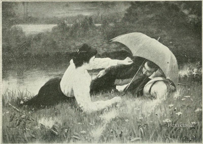 Der Frühling kam, schöner als je, meinten die Liebenden, und mit, ihm neue Hoffnung. Wir machten einen Spaziergang in Gesellschaft einiger anderer Familien. Alborns nahmen auch Theil an der Partie, Justus und Agathe aber — neckten sich bereits wieder. Ja, das heitere Wortgefecht wollte gar nicht enden. Trieben sie's auch nicht zu sehr auf die Spitze? Richtig, da hatte es Justus! Mit eins schien Agathe wirklich ungehalten. „So, meinen Sie? das ist ja recht schön — ich bin anderer Meinung.“ Dabei zuckten ihre Wimpern in raschen Schwingungen, die Wangen zeigten eine bedenkliche Neigung, ihr blühendes Kolorit hastig in ein paar einzelne kleine rote Fleckchen zusammenzuziehen, und selbst die fein geschnittenen Nasenflügel bebten ein wenig von der plötzlichen Aufwallung — die jedoch nicht der Anmut entbehrte. Alborn fand die Gereizte nur noch reizender! Agathe ließ ihn denn auch nicht lange in Zweifel über ihre wahre Gesinnung. Mutter Natur hat die weibliche Grazie so überreich ausgestattet: eine junge Dame, die nicht auf den Kopf gefallen ist, wird nie um Mittel und Wege verlegen sein können, zart anzudeuten, dass sie — nicht zürne, und sie wird meistenteils auch wohl verstanden werden, wenn der junge Mann nicht gar zu schwer von Begriffen ist, Agathe vergab sich nichts, sondern sie streichelte nur ihren Sonnenschirm mit so vieler Herzlichkeit, dass Justus stutzte. Es war, als ob eine gewisse wonnige Bestürzung, die ihn bis ins Innerste durchzitterte, den Schlag seines Herzens auf einen Moment anhielt — dann schlug es wieder in desto volleren Pulsen, und mitten in aller lachenden Fröhlichkeit glitt blitzschnell ein leichter Zug gespannten Aufmerkens über sein Gesicht, wie wenn ihm urplötzlich ein Gedanke von unendlicher Tiefe, von unberechenbarer Tragweite aufging. Justus' Bildung und Wissen beschränkte sich nicht einseitig auf sein Fach, unter Anderem hatte er auch recht hübsche technologische Kenntnisse — war es vielleicht die epochemachende Entdeckung, dass grüner Taffet und Fischbein unmöglich so gefühllos sein könnten, als die exakten Wissenschaften bisher angenommen, was ihm so mächtig an die Seele griff? Auch wechselte Alborn leicht die Farbe, und wie schön stand das seltene Erröten dieser männlich energischen Physiognomie! Doch das Alles war im Augenblick vorüber.